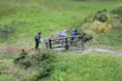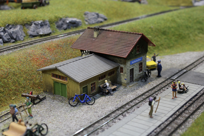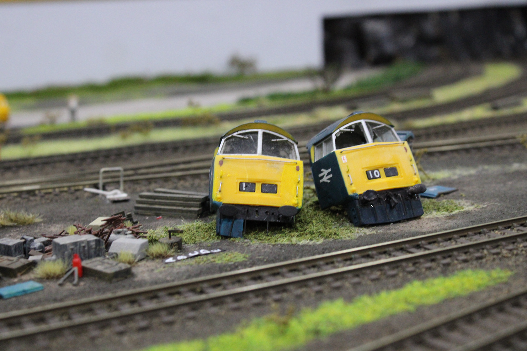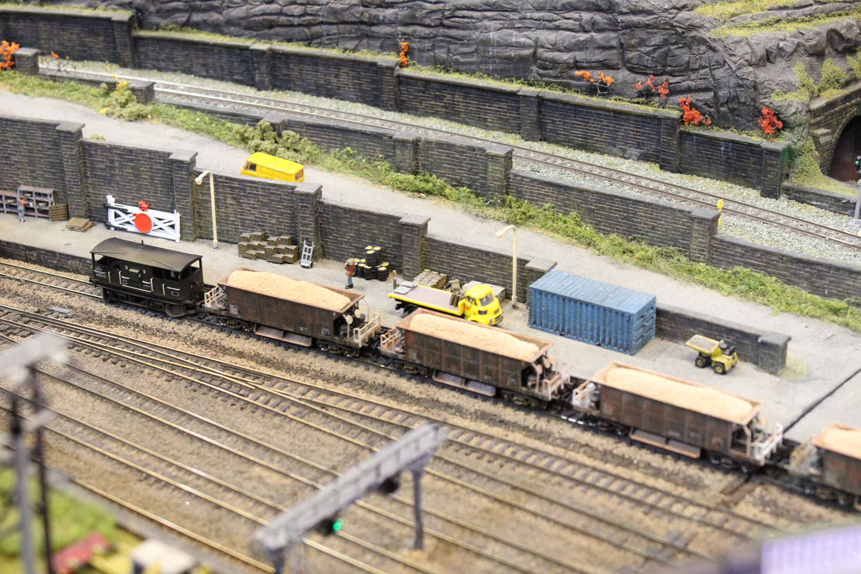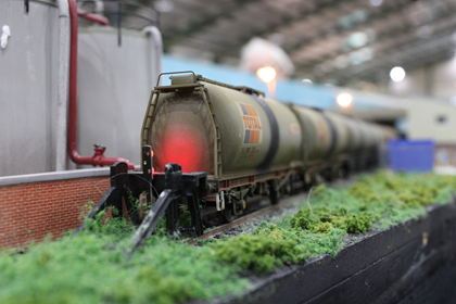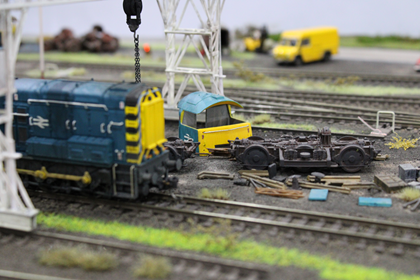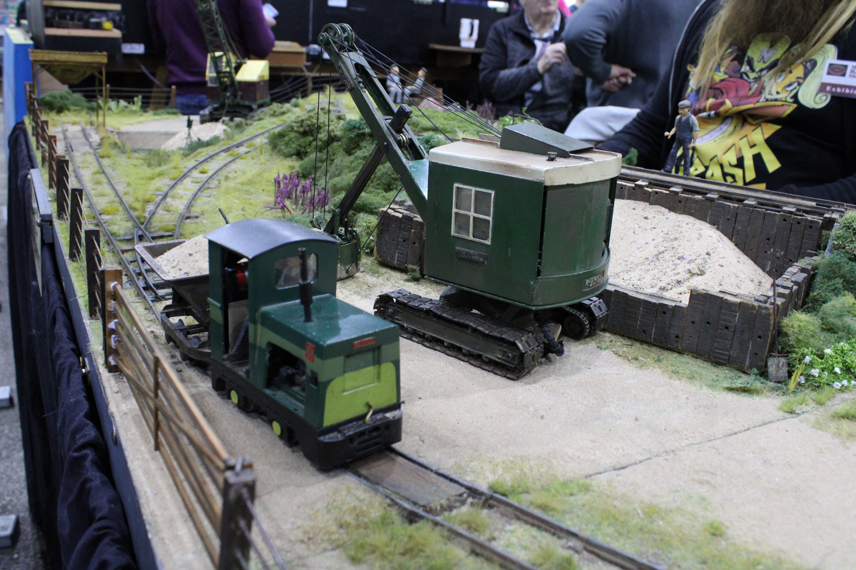 M operation is 'hands-off with points being changed by a 'wire in tube" system - actually camera shutter release cables. Before these, servo motors did the job, but their gears didn't like coming into contact with the sand. Unloading the wagon is achieved using another cable. this one designed to work the choke for an MG Metro car to for tipping. The skip body is righted by a length of wire as the train passes by. Both diggers are operated with nothing more complicated than a series of double-pole double-throw switches. Simple that is. until you realise that at least two switches need to be operated at the same time for some movements. Once you've filled the dragline bucket. it has to be raised up but if you don't let out the line used to pull the scoop towards the digger, the bucket tips forward. emptying it again. Novice drivers can spend a lot of time dumping sand where they don't want it. The experienced team makes it all look so easy.