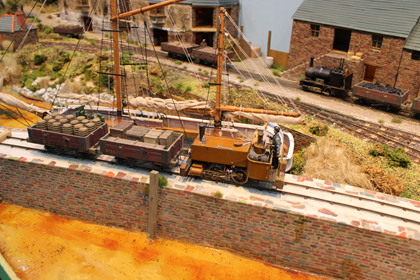 Campbell's Ouany demonstrates that ifs even possible to build large scales in small spaces. The model measures 5ft 6in by 2ft bin but packs in enough operation to entertain visitors at exhibitions. Fundamental to the design is a pair of working excavators - a Ruston-Bucyrus dragline and Ruston•Bucyrus Crowd Shovel. Both work in the same way as their prototypes dating from an era before hydraulic power, they fascinate viewers with their collection or ropes and pulleys all skilfully operated to scoop sand to load the skip wagon trains. The red and cream dragline was the first excavator model built by John Campbell. Modelled with the post•1954 cab, the model is electrically powered and plugs into the baseboard with an umbilical cable. Constructed as a removable unit for both transport and maintenance inside the body is a complicated construction housing all the motors and gearing. This allows the machine to perform all the actions of the prototype apart from driving itself around the site. M those ropes and pulleys must run smoothly and reliably too. The layout operates continuously at shows scooping many scale tons of sand so temperamental machinery cannot be tolerated. With the dragline built, the design of the layout was worked out around it. If you have a working dragline, you want to dig something and tip it into skip wagons. These need to go somewhere to be unloaded and that somewhere needs to be high enough for the load to fall out into a pile. This means the design has to incorporate an incline to raise the track bed up a few inches. Loaded wagons hauled around tight curves on less than perfectly laid track work is the territory of the narrow gauge industrial diesel and in 16mm scale, there are plenty of kits available. Unfortunately. these normally only drive a single axle so don't provide enough traction for the job, so John scratch-built all his models only using kit parts where they were appropriate and made the job easier. His formula used for all the models includes worm and wheel enclosed gearboxes driven by can motors and Debin chainsets to make each model four-wheel drive. This isn't a problem: all the locos carry their own power in the form of MA rechargeable batteries. With four locos to choose from and only one required at a time for operation, the others can be on charge. As well as spreading the wear, this ensures viewers who return to the model during the day see a different engine in use.